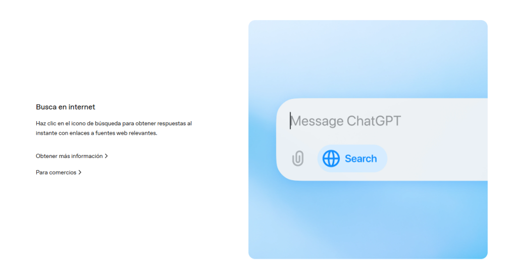Captura de pantalla de chatgpt.com, donde explica las nuevas funcionalidades de su versión 5.2, entre ellas: «Busca en internet. Haz clic en el icono de búsqueda para obtener respuestas al instante con enlaces a fuentes web relevantes.»